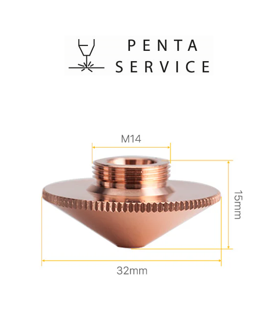 Сопло PENTA SERVICE высотой 15 мм, диаметром 32 мм, имеет диаметр отверстия 2,0 мм и резьбу М14, произведено из меди с соблюдением всех необходимых стандартов качества, технических и геометрических параметров изделий данного типа. В результате применения, сопло гарантирует сохранение расчётных параметров в течение длительного времени и обеспечивает высокую мощность работы оборудования лазерной резки.